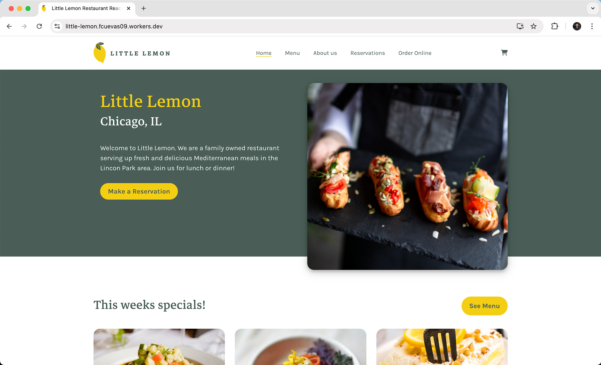 Built from Scratch Using React A fully responsive and interactive restaurant website designed and developed to enhance the customer experience. The site features an intuitive menu interface, a seamless reservation system, and visually appealing layouts that adapt beautifully across devices. The project highlights my ability to combine UI/UX design principles with front-end development to create engaging and functional web experiences.